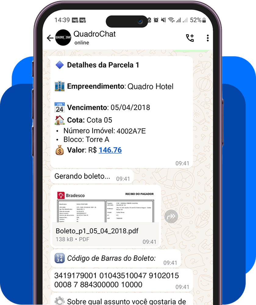 O QuadroChat se integra com o eSolution Access Center e o TimeShare Explorer (TSE) para processos automatizados de pós-vendas, incluindo consulta de contratos, saúde financeira, emissão de boletos e régua de cobrança via WhatsApp.